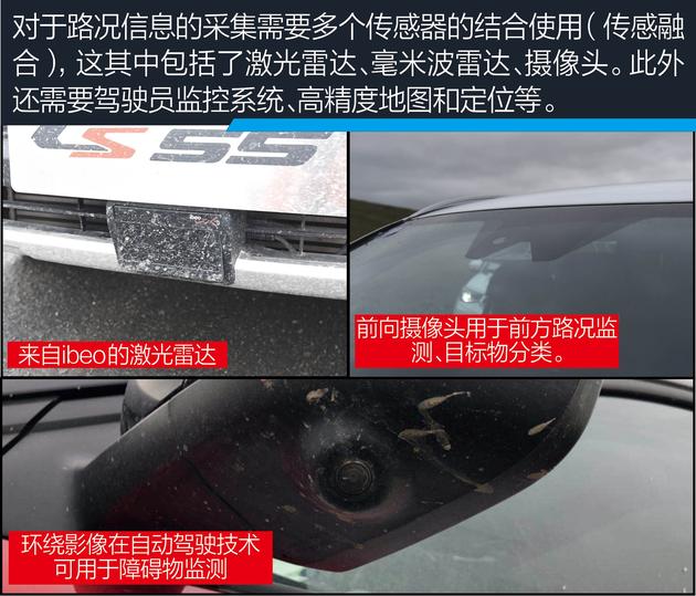 除传感器外之外,还需要驾驶员监控系统和高精度地图和定位。在这次的CS55试验车上,主要搭载了激光雷达、前向摄像头、毫米波雷达、环视摄像头、超声波雷达用于探测路况环境信息。