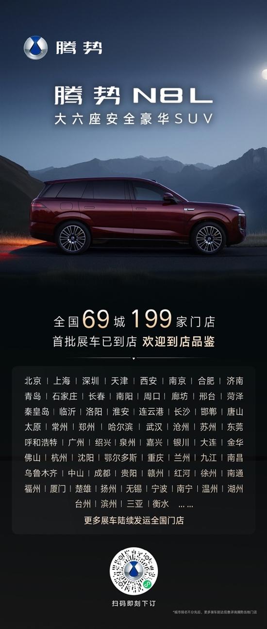 快科技10月4日消息,近日,比亚迪旗下腾势品牌全新大六座豪华SUV——腾势N8L传来新动态,全国69城199家门店已陆续迎来首批展车。
