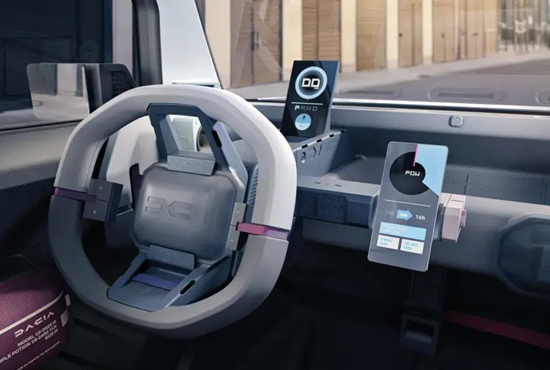 车内为极简的风格理念,样式前卫的双辐方向盘十分显眼,仪表盘和中控屏均采用类似手机一样的造型,个人猜测可以随时取下当做移动设备使用。