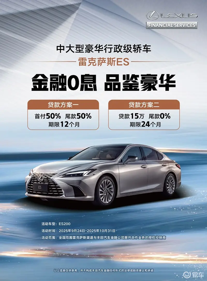金秋十月,车市消费热潮持续攀升,国庆期间各地大型车展人头攒动。或许您在车展上已对某款高端车型一见倾心,却又在预算面前仍有犹豫,怕首付压力大、怕月供影响生活、怕资金周转不开……现在,好消息来了!丰田汽车金融携手雷克萨斯,特别推出面向雷克萨斯NX、ES等热门车型的0息及低息金融方案,以灵活的金融支持,全方位适配不同消费需求,助您轻松将心仪座驾开回家。