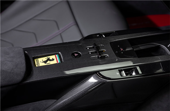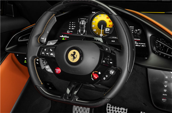 新车采用带有实体按键的全新方向盘,标志性的红色发动机启动按钮也没有缺席,方向盘下方为硕大的换挡拨片,转向灯按钮也集成在方向盘实体按键上方。