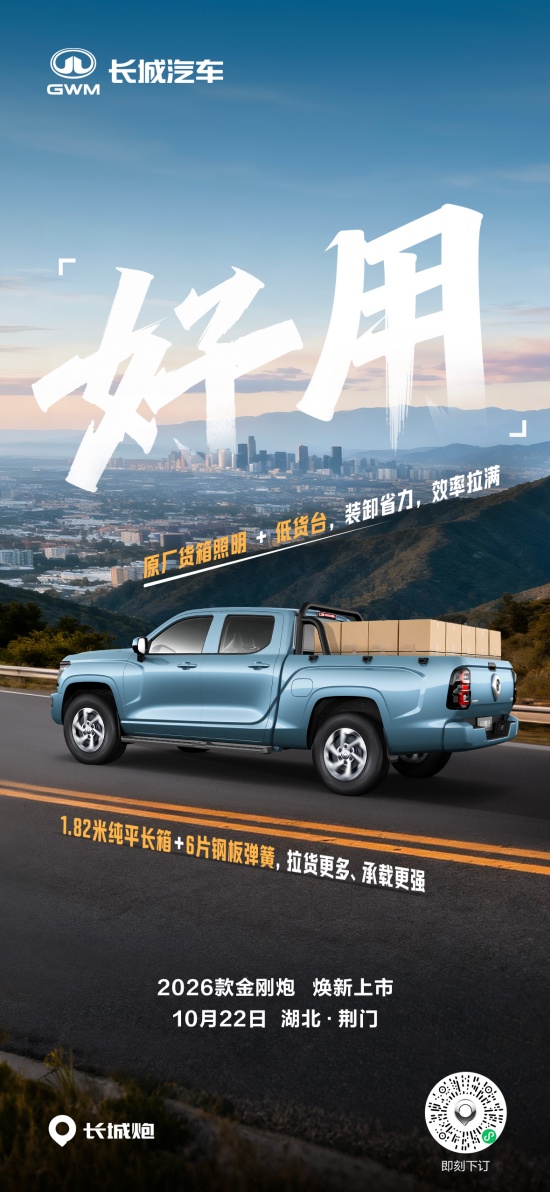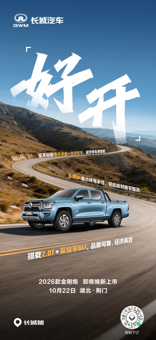 转自 车质网 目前,我们从长城汽车官方获悉,2026款金刚炮将于10月22日在湖北荆门正式上市。新车将搭载2.0T+8AT动力总成,全系标配电子手刹+自动驻车,最小转弯半径5.95米。