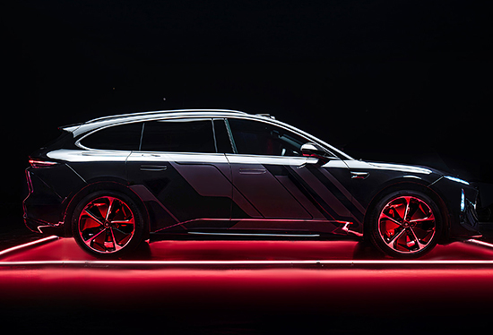 侧面依然还是标准的旅行车结构,搭配全新的20英寸五辐式风速轮毂,内置“气辉橙”制动卡钳,套装价值13000元。此外,蔚来ET5T暗影套装限定版还标配与冠军纪念版同款的底盘装备,例如前后防倾杆升级,抗扭刚度提升6%,并且还拥有专属的运动化底盘调校以及EP Mode模式。