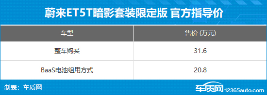 转自 车质网 10月17日,蔚来ET5T暗影套装限定车型正式上市,共推出1款配置,整车售价31.6万元,BaaS电池租用方式售价20.8万元,限量发售555台。新车基于《创:战神》电影为设计灵感打造,车身印有赛博光影拉花,视觉效果个性前卫。2025年10月31日(含)前锁单的用户,可免费选装交流充放电套装(或置换价值4000元的选装基金),并可享5年NOP+免费使用权以及获赠价值9500元的适享套装。