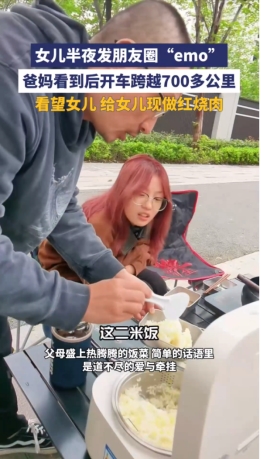 老父亲即刻打包食材,和妻子连夜出发,开启了700公里的关爱之旅。将到饭点,老李骗女儿“给你点了外卖,等下去取”。女儿午休时,看到父亲亲手端出二米饭、红烧肉等家常菜时,满脸惊喜。饭桌上,老李安慰女儿:“人生进度有前有后,干啥不如来碗红烧肉,吃饱之后,把负面情绪挨个揍”。这顿跨越千里的家常菜,让女儿感受到来自家人无声却暖暖的爱,无论身处何方,家的味道永远是最妥帖的慰藉,而父母永远是那个愿意为你星夜兼程的人。