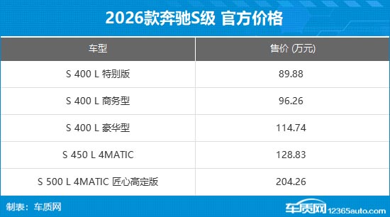 转自 车质网 今日,我们从梅赛德斯-奔驰官方获悉,旗下2026款奔驰S级正式上市,新车共推出5款车型,售价区间为89.88-204.26万元。作为年度改款车型,新车新推出了S 400 L特别版车型,成为新的入门版车型,进一步降低了购车门槛。