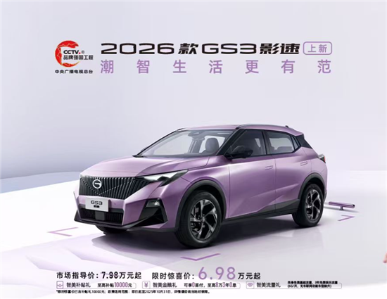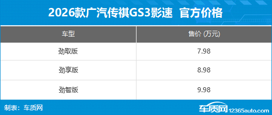 转自 车质网 日前,2026款广汽传祺GS3影速正式上市,新车推出3款车型,官方售价7.98-9.98万元,限时惊喜价6.98-8.98万元。新车主要在内饰及配置方面进行升级,其他方面变化不大。