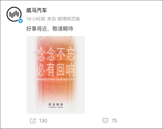 转自 车质网 近日,从相关渠道获悉,威马汽车官方账号发布“好事将近,敬请期待”预告,并同步公布一张新车预告图。结合此前信息来看,这或预示着威马即将正式复产。