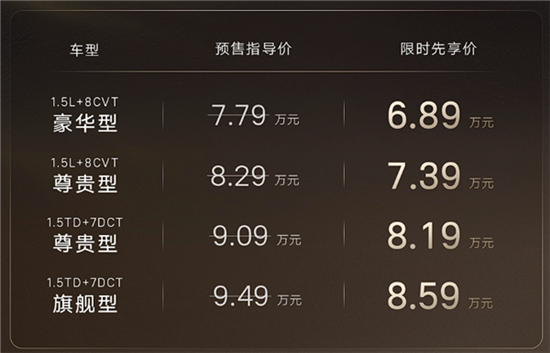 新车此前已开启预售,推出四款配置车型,其中1.5L+8CVT豪华型限时售价6.89万元,尊贵型7.39万元;1.5TD+7DCT尊贵型8.19万元,旗舰型8.59万元。