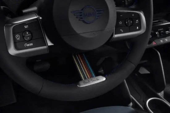 在细节方面,新车在外后视镜、八边形进气格栅及车顶均采用诺丁汉绿进行装饰,且车顶还加入了Paul Smith经典条纹,另一种黑色车顶则采用暗调条纹。侧面所有车型均配备18英寸幽影黑铝合金轮毂,采用碳钢灰色调的深色涂层,轮毂诺丁汉绿的轮毂盖上印有Paul Smith手写签名,车辆前后专属的炭蓝色MINI标识与后备厢把手上的Paul Smith签名呈上下错落分布。