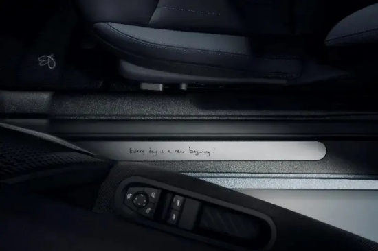 值得一提的是,当车辆在解锁时,还有设计师手写体的“Hello”灯光投影映在地面,迎宾踏板上也印有“Every day is a new beginning(每天都是全新的开始)”字样,驾驶位地垫还带有Paul Smith手绘的兔子图案。