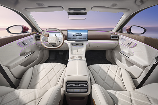 内饰部分,新车营造出兼具科技感与温润格调的座舱氛围。双色双辐式多功能方向盘与全液晶仪表盘相得益彰,奠定了前卫的驾驶基调。仪表台则以悬浮式多媒体触摸屏为核心,布局简洁明快,下方集成了空调出风口、实用物理按键、无线充电面板及双独立杯架,功能分区清晰,兼顾了操作的便利与视觉的整体性。