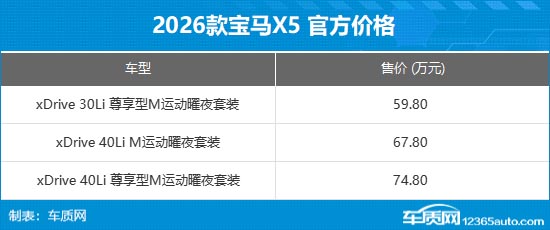 转自 车质网 今日,我们从宝马官方获悉,旗下2026款宝马X5正式上市,共推出3款车型,售价区间为59.8-74.8万元。新车车型从之前的4款减少至3款,售价也有所降低。据悉,新车将在广州车展期间与大家见面。