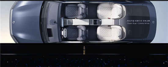 中控配备15.6英寸悬浮屏,搭载高通骁龙8295P芯片,配备10升电动冰箱、14.5英寸娱乐屏、行政桌板等,还有7块遮阳帘确保隐私。