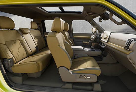 整车多以方正的线条修饰,深色的包围将整车的户外属性进一步提升,车顶还设置有行李架,方便后期拓展。尺寸上,新车轴距为3300mm。