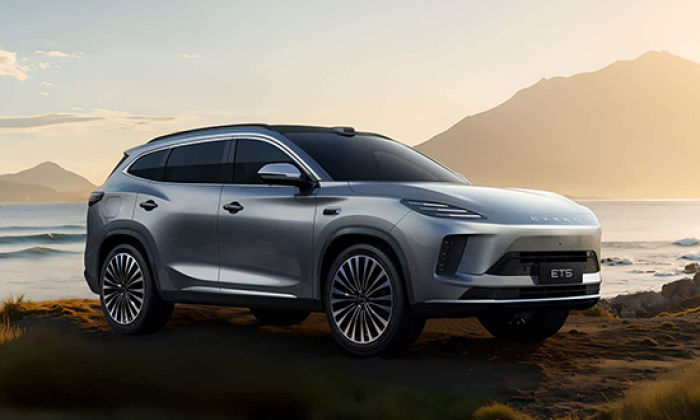 外观设计极具辨识度,采用莱布朗紫金属漆与日落红的双色调搭配,两种色彩在车身表面实现流畅过渡,其间点缀的金色闪光颗粒让车身在光线下更具质感。同时,车身配备金属色装饰条与同色系21英寸轮毂,进一步强化了整车的高端气场。