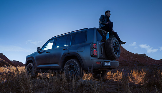 尾部延续高耸的硬朗风格,纵向排列的尾灯辨识度十足。后备厢为侧开设计,并搭配外挂式备胎,为户外越野提供了更强的实用保障。此外,其采用双油箱形式,油箱容积达131L。
