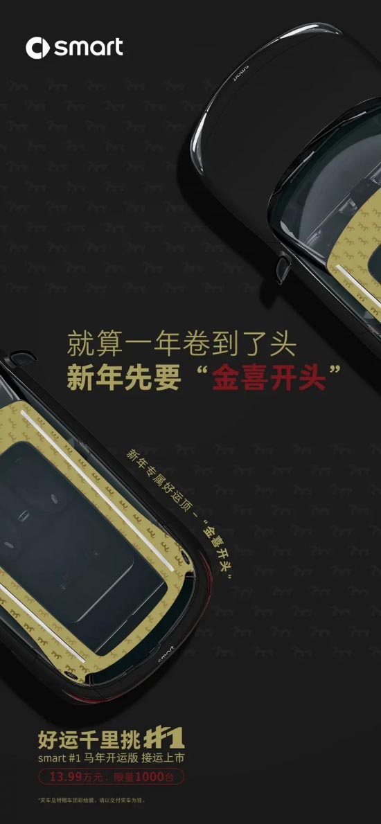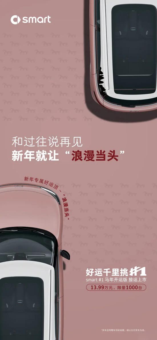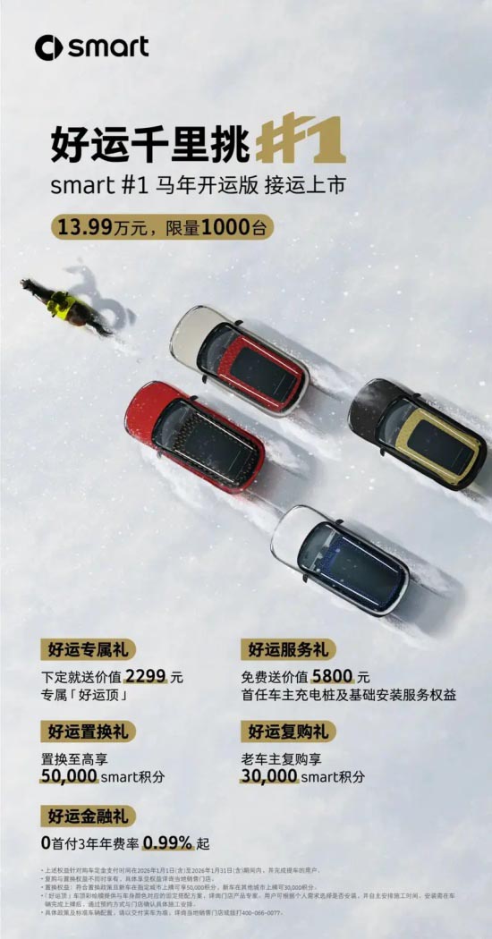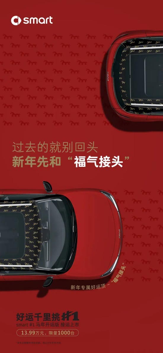日前,我们从smart官方获悉,旗下smart精灵#1马年开运版已正式上市,售价13.99万元,限量发售1000台。同时,官方还表示购买新车可享专属“好运顶”、免费充电桩及基础安装服务、置换及复购积分赠送、0首付及低利率等五重福利。