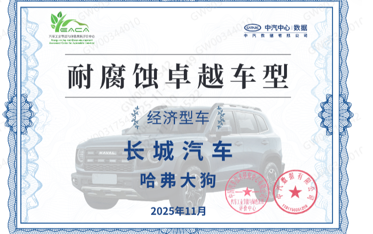 五年间,哈弗狗品类不仅收获了73万用户的坚定信赖,同时也在权威评选中屡获殊荣:其中,哈弗大狗先后荣膺2025年中国燃油汽车用户满意度CACSI测评10-15万紧凑型SUV第一名,以及中汽中心数据测评经济车型“耐腐蚀卓越车型”奖项。这些权威奖项,既彰显了用户对产品质量、售后服务的全面认可,也印证了其在整车工艺、耐久性方面的过硬实力。
