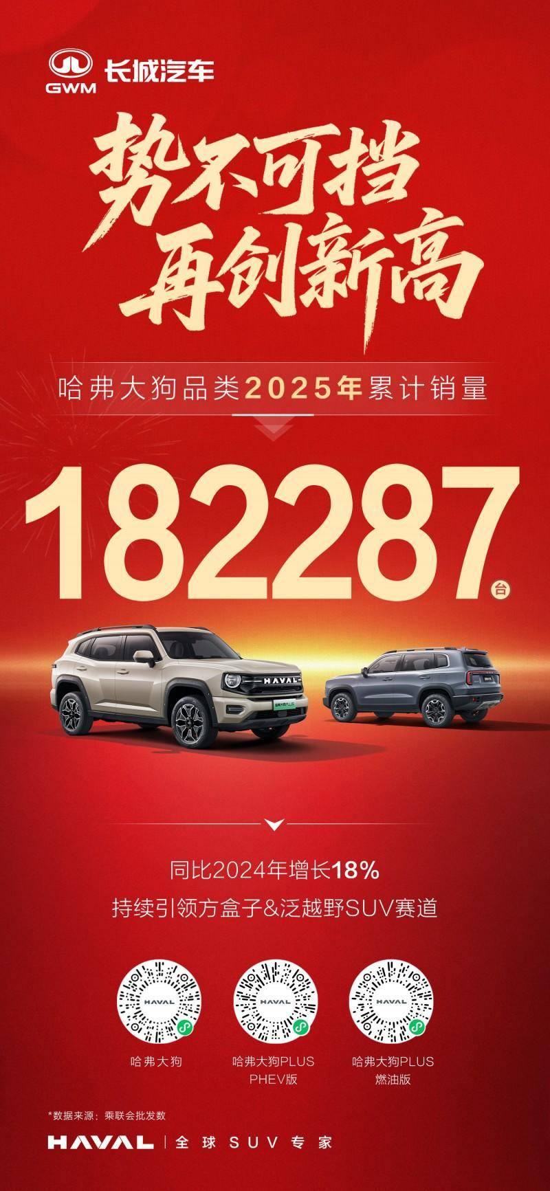 2025年,哈弗狗品类再传捷报:全年累计销量达182,287辆,历史累计销量更是突破731,977辆!截至2025年年底,哈弗狗品类已经实现连续19个月销量破万、累计43个月蝉联泛越野及方盒子品类销量冠军,在泛越野赛道上书写了从“开创者”到“引领者”的市场传奇。
