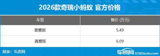 从官方获悉,2026款奇瑞小蚂蚁正式迎来上市,新车推出喜爱版、真爱版两款配置,市场指导价区间为5.49-6.09万元,叠加优惠后限时增购价5.19-5.79万元,置换双补价4.65-5.16万元,报废双补价低至4.26-4.72万元,性价比优势显著。