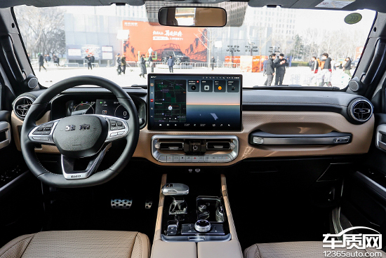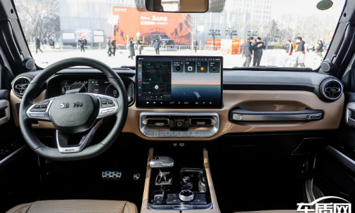 内饰部分,新车针对整体布局进行了优化升级,科技氛围明显提升。提供黑灰和黑棕两种双色内饰方案,配备15.6英寸悬浮式中控屏,内置高通骁龙8155芯片,并匹配16G+128G存储组合,拥有更出色的使用体验。此外,在强调科技感的同时,作为一款硬派越野车型,新车依然保留了必要的物理按键。