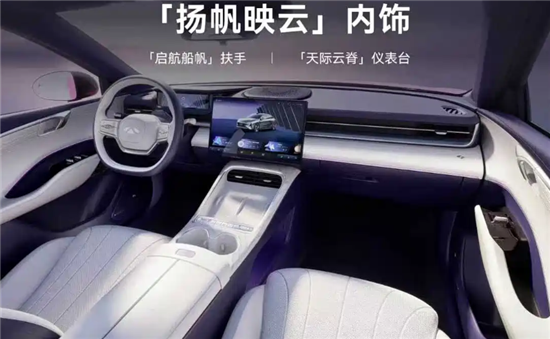 外观采用凌风造型设计,极简前脸搭配风刃镭雕灯组与导流槽,车顶搭载激光雷达,轿跑姿态动感十足。车身尺寸为4860mm*1890mm*1480mm,轴距达2900mm,穹顶天幕延伸至后窗,配合运动化尾灯与疾风后扰流板,颜值出众。
