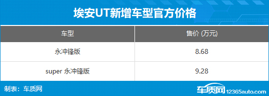 日前,从相关渠道获悉,埃安UT新增两款车型,分别是永冲锋版和super 永冲锋版,前者电池租用购车价5.28万元,电池月租金限时终身优惠价399元/月,整车购车价9.28万元;后者购车价8.68万元。另外,湘超球迷可立享1000元购车基金。