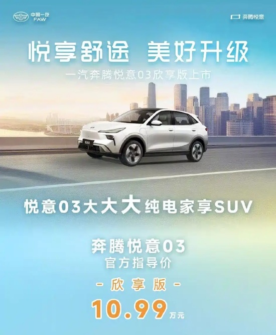 日前,我们从一汽奔腾官方获悉,旗下奔腾悦意03欣享版车型正式上市,指导价10.99万元。同时,官方还推出了限时购车权益,置换购车享5000元厂家补贴、额外提供4000元购置税补贴以及支持60期0息贷款,月供低至千元级。