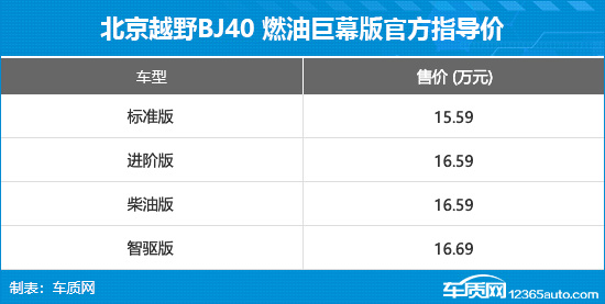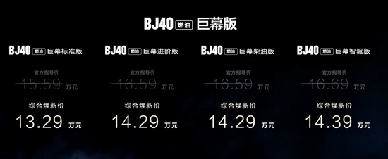 转自 车质网 1月27日,2026款北京越野BJ40燃油巨幕版正式上市,新车共推出4款配置,官方指导价15.59-16.69万元,综合焕新价13.29-14.39万元。同时,官方还推出了全系7重礼。作为新增车型,其主要针对配置进行了升级。