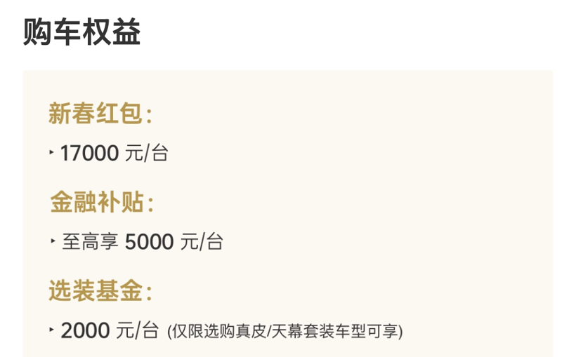 可选7年分期,前5年0息,或1万元保险补贴,或免费选装高性能空气悬架系统以及3万积分。