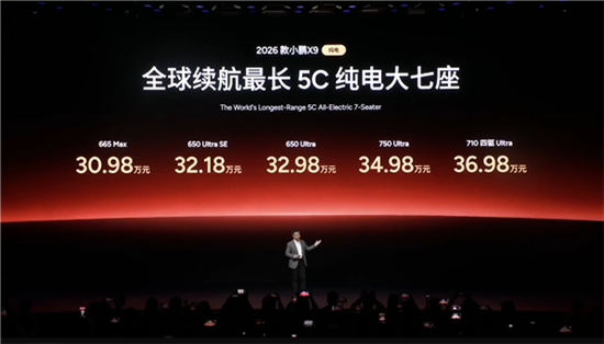 2026款小鹏X9纯电版正式上市,共推出五款车型,售价区间为30.98-36.98万元,续航起步为650km,最高为750km。