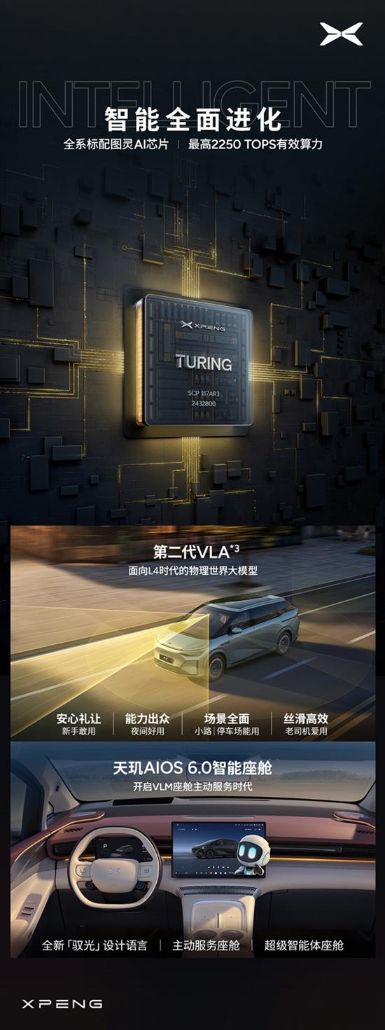 新车首搭第二代VLA大模型,全系标配图灵芯片,最高有效算力2250Tops,第二代VLA私人司机上车,全场景覆盖,园区小路、乡村土路、没有导航也能开,AI辅助驾驶能力上限将提高超过10倍。