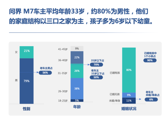 从车主画像来看,问界M7用户呈现出明显的年轻化、高知化和家庭化特征。调研数据显示,其车主平均年龄33岁,以三口之家为主,孩子多为6岁以下幼童,本科及以上学历占比85%,公司白领与管理层是消费主力。这类用户既有较强消费能力,也有清晰的品质追求。他们既希望车辆能满足日常通勤、接送孩子等刚需,也期待周末露营、朋友聚会、短途自驾时拥有更好的出行体验。问界M7正是抓住了这一点,让每一次出行都更贴近家庭生活的实际需要。