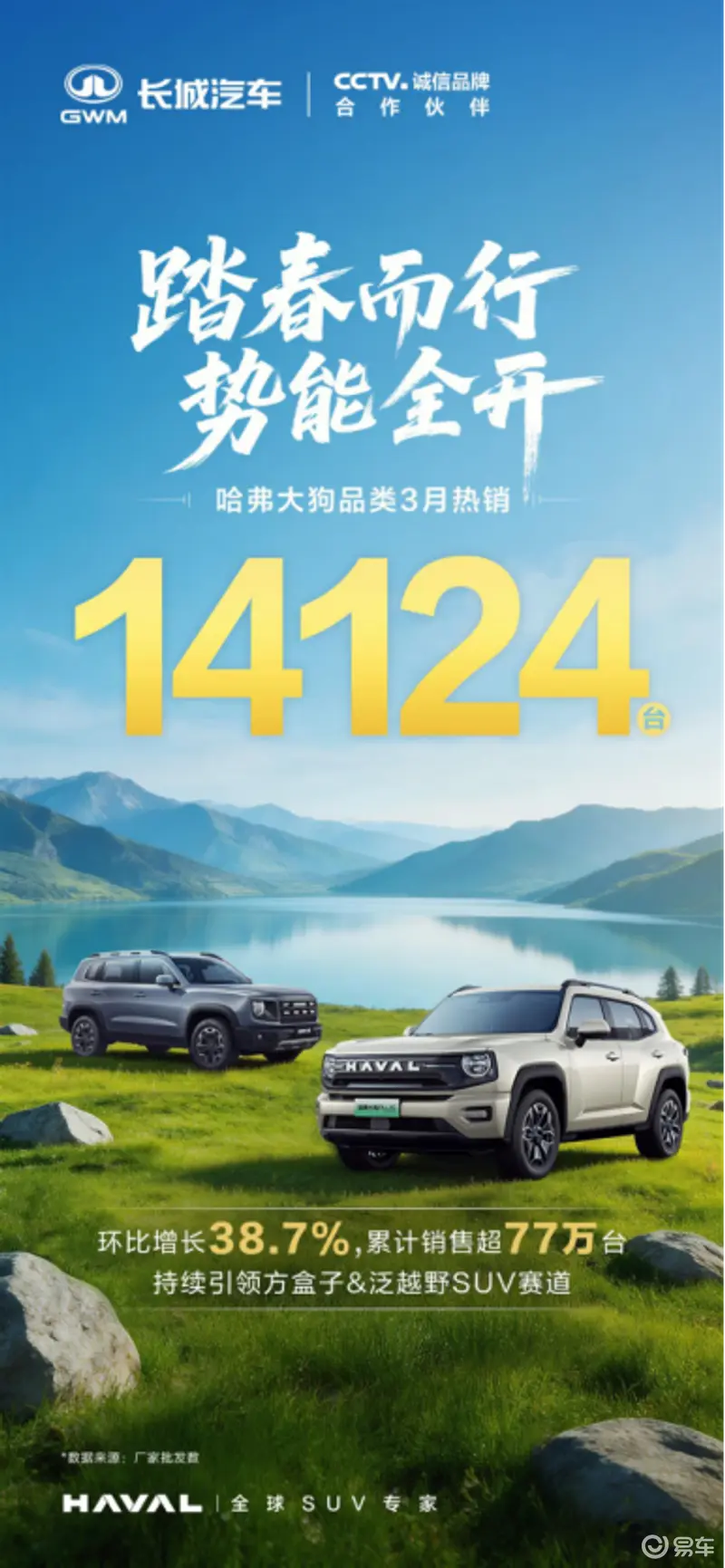 三月春风拂面,正是奔赴山野、邂逅春光的好时节,在这盎然春意中,哈弗大狗品类以一路热势交出亮眼答卷——3月热销14124台,累计销售超77万台,持续领跑方盒子&泛越野SUV赛道,成为无数人春日出行的潮野之选。这份成绩,是用户对哈弗大狗品类“可城、可野、可潮”全场景实力的认可,更是春日里,每一份奔赴自然、向往自由的出行心声写照。