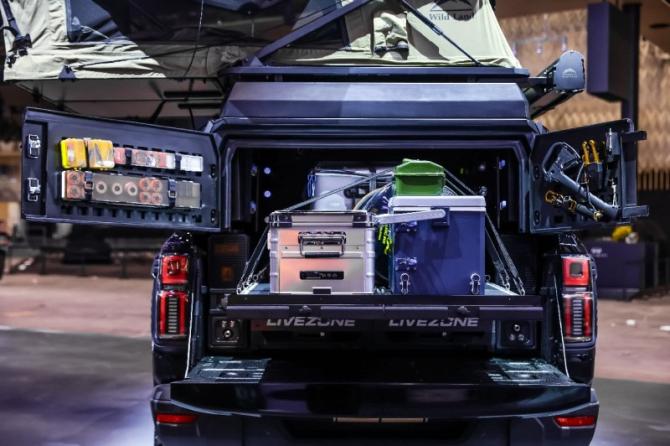 露营配置一步到位,车顶搭载秋野地庄游硬顶帐篷,搭配侧天幕;17L冷藏+3L冷冻金属冰箱、两个40L清水箱,配备增压水泵、户外灶具;后箱LED照明、侧面工作灯以及移动氛围灯,让野钓不摸黑,露营更带感。硬核性能同步强化,升级氮气减震,2.5寸底盘升高,极限路况应对更轻松,同时还搭载车顶探索灯等。所有改装均模块化设计,无损安装,好用省心。